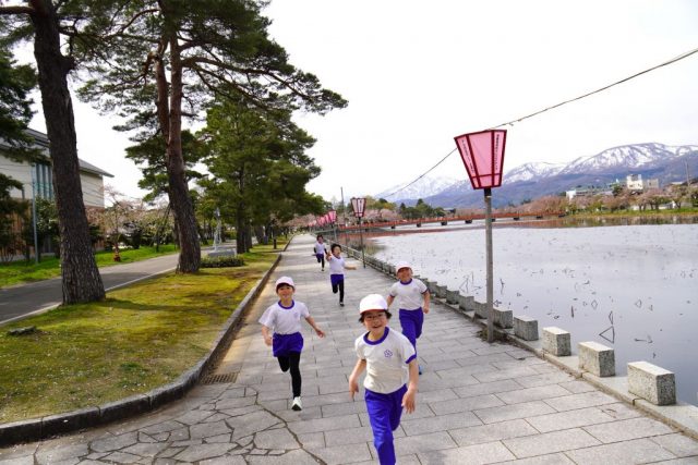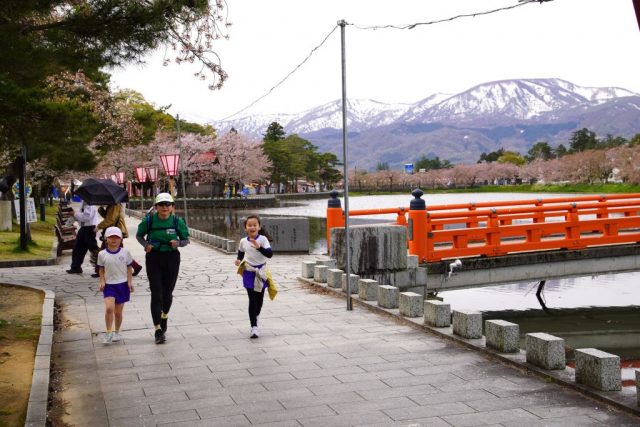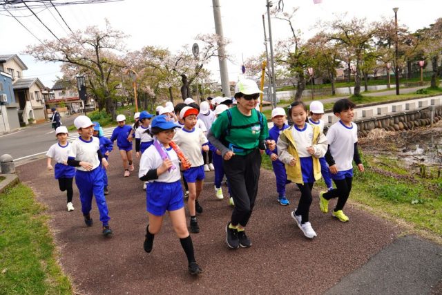 4月13日、子どもは、高田走ろう会の宮澤さんと出会いました。宮澤さんは、これまでにえちご・くびき野100kmマラソンに何度も出場され、50kmコースを6回完走されている方です。教室で宮澤さんの自己紹介を聞いた後、早速外にかけ出し、西堀の周りを一緒に走ったり歩いたりしました。