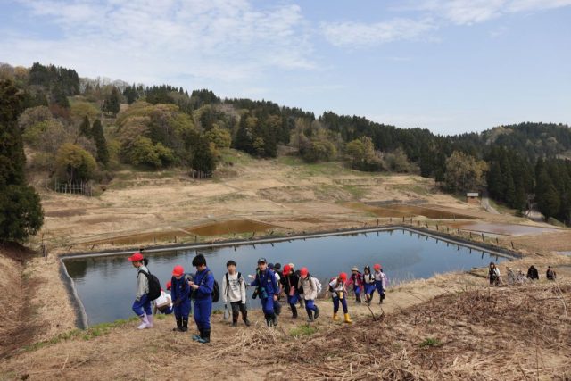 4月15日(水)、子どもは行き先を知らないまま、バスに乗り込み、学校を出発しました。市街地を離れ、車窓から見える景色は、家やお店の建物から木々や田畑の緑に変わっていきます。着いた場所は、一面に広がる棚田と山々が見渡せる場所。子どもは「ここはどこ」「自然系の活動かな」と言いながら、棚田の畦道を探検しました。
