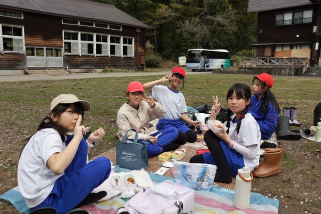 昼も近くなり、川上会館を訪れた子どもは、グラウンドでレジャーシートを広げ、お弁当を食べました。グラウンドの端に「川上小学校跡」という石碑を見つけ、「昔はここに川上小学校があったってことだ」「いつまであったんだろう」と話しました。