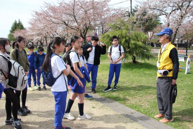 4月13日、子どもは高田城址公園を訪れました。芝生広場で2名の観光ボランティアガイドの方と出あい、観桜会をガイドしていただきました。公園やお堀の周りを歩きながら、桜や歴史について説明を聞きました。