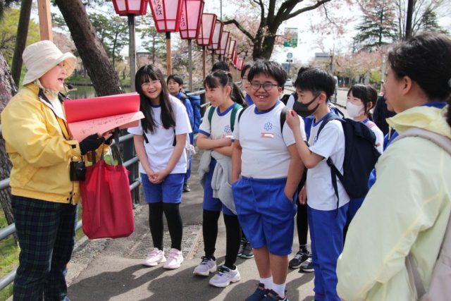 「今日、初めてのお出かけがありました。創造活動名は『めぐりておもてなし』です。今からでも楽しそうな予感がします。今回はまず高田公園に行きました。そこで待ってもらっていたガイドの人に案内してもらいました。歩きながら桜やお城について教えてもらいました。しょうじき、ここで生まれてそだったから知ってるでしょって思っていたけれど、知らないこともあって勉強になりました。(後略)」